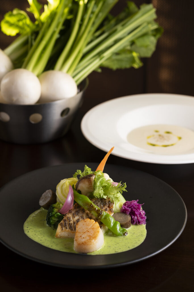 前菜に盛り込まれたさまざまな地元食材。メインコースでは新鮮野菜に魚または肉が続く。デザートもまた数種類の小皿料理で構成され、美しく盛り付けられていて目にも楽しい。手頃な価格でフランス料理の体験を提供できる店が、清瀬にはあります。